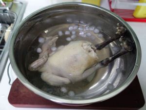 煮好的土鸡迅速放入冰水中冰镇。在这儿我突然想到一个词:冰火两重天。这个程序可以让鸡皮产生爽脆的口感。