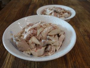 等鸡完全凉透,捞起来滤干直接斩块或者手撕去骨装碗。