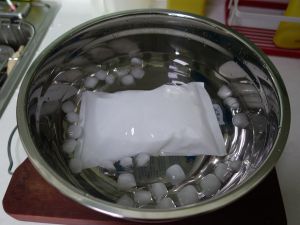 在煮鸡的同时,准备一盆冰水备用。我用的冰块是头一天晚上冻好的,也可以用冰袋或者瓶装冰冻矿泉水。总之各种冰凉就对了。