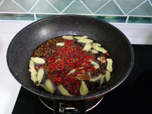 洗干净锅,放入少许两汤匙油,剩余花椒,小火爆香后捞出花椒,