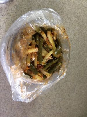 把泡菜捞出,冷水冲两遍然后风干一个小时。豆角切段、姜切粗丝跟豆角一样长,小米椒直接整个放进去。我自己用香油熬的红油晾凉了以后拌泡菜,然后装瓶就可以放冰箱随吃随取。很酸爽、很脆,很下饭也很开胃~
