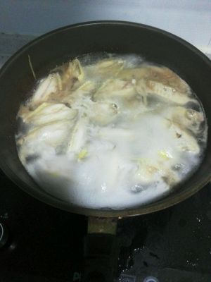 鸡翅洗净并在面上划俩道,生姜切丝,入水煮至鸡翅颜色变黄,