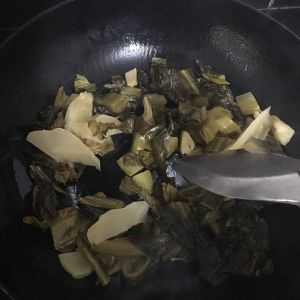 锅中加油烧热后放入蒜瓣,豆瓣酱,姜片,干辣椒段爆香,再加入酸菜翻炒,将酸菜炒出香味后一起放入锅中即可。