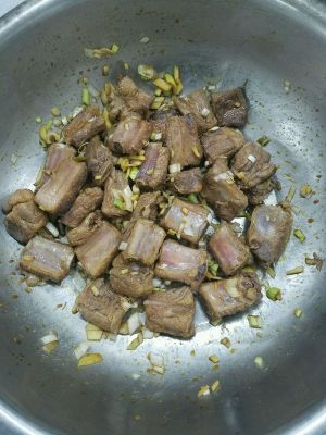 把料酒 (一匙),老抽(一匙),醋(二匙)放入煮好的排骨,腌制二十分钟。