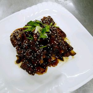 排骨七分熟时把事先弄好的糖醋汁倒入,直至收汁,撒上芝麻葱花
