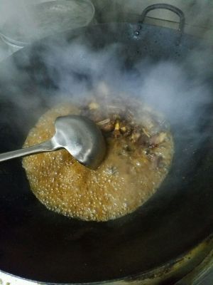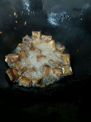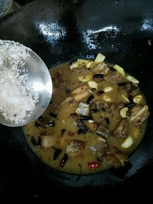 锅里留一匙油,加热,将冰糖放入使其完全融化,放入炸好的排骨,再加入煮肉的汤二锅勺,加入三匙白砂糖(可多加,根据个人口味),加半匙盐提味。