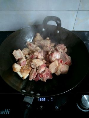 锅热后放少许食用油,油热倒入切好的排骨,翻炒。