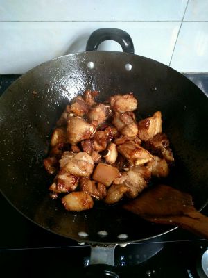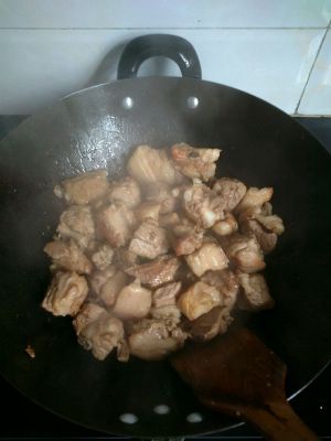 放入糖,可以多放点,因为要的就是酸甜味,继续翻炒至出糖汁,肉呈红色,盛入碗中,用电压锅焖炖。
