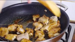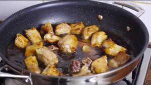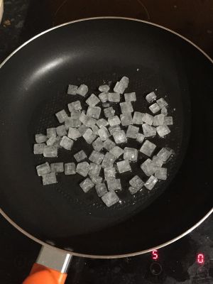 起油锅,倒入敲碎的冰糖,中火加热至冰糖融化呈现金黄色