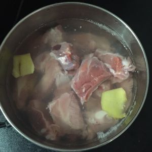 在一锅冷水中放入2片姜,倒入排骨,大火烧开后捞出排骨沥干待用