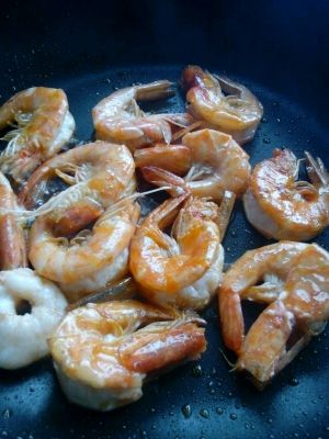 热锅下油,(油要多一点)大火下虾把虾焖煎到虾壳微焦,翻面,同样焖煎到虾壳微焦。