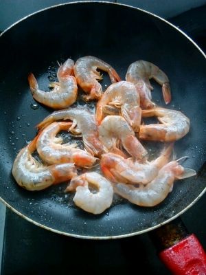 锅烧热,少许油煎虾。煎至两面酥脆,煎出虾油。