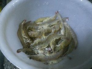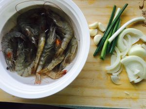 虾用水龙头冲洗干净,剪去虾须虾枪。