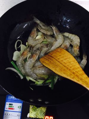 下大虾,炒至变色,(约几十秒)