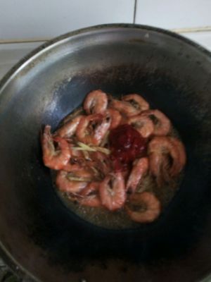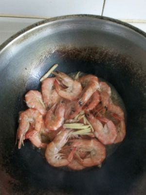 锅内下油,烧热后放入姜丝,炒出香味,下如大虾。