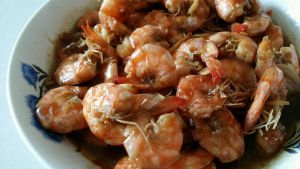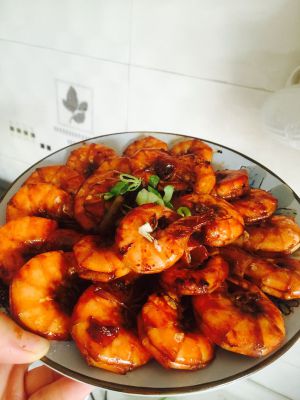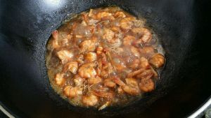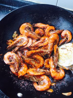 起锅油稍多,放入葱姜蒜爆香,倒入腌好的大虾,再滴些许料酒,生抽,老抽,糖少量,翻炒,如果喜欢麻还可以放些花椒