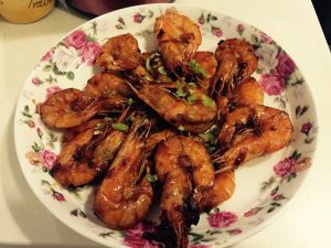 3.热油:放入花椒、姜、蒜、红辣椒、白糖翻炒、后放入虾翻炒、待虾变色、放入调好的酱汁继续翻炒、加入适量的盐、味精调味最后倒入少许开水,大火收汁。