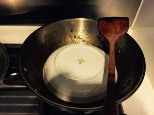 煸炒至虾的身体上裹上酱料,就拿盘子扣住虾,油焖大虾嘛,所以一定要焖!大概有个十秒、二十秒的就可以出锅了