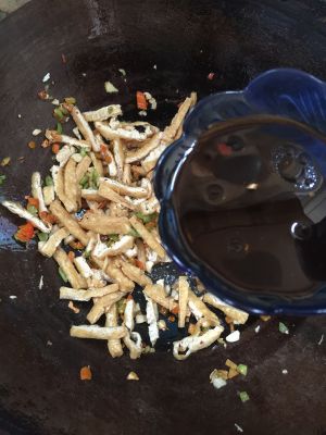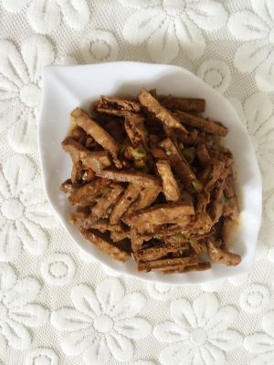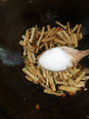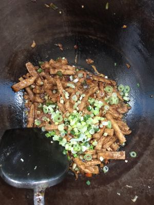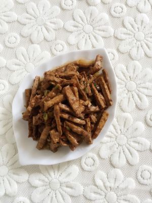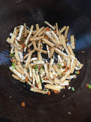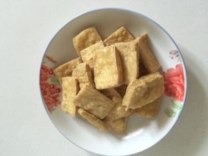 油热锅后炸切好的豆腐干,微焦捞出备用