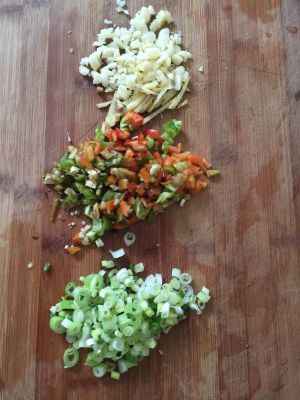 蒜瓣剁碎,生姜切成丝,红辣椒切成末,葱切成葱花备用!