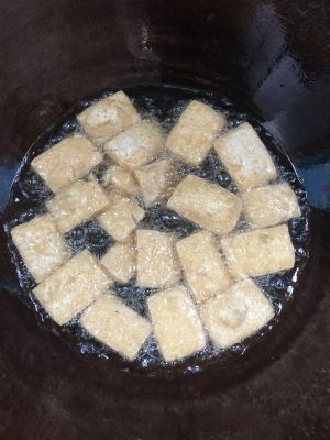 锅热放油炸豆腐、先中火后大火、中间不要总是翻动豆腐容易散,炸制两面金黄变色捞出