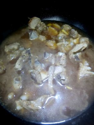 加生抽、老抽、冰糖、盐、排骨汤,大火烧开后转中火。