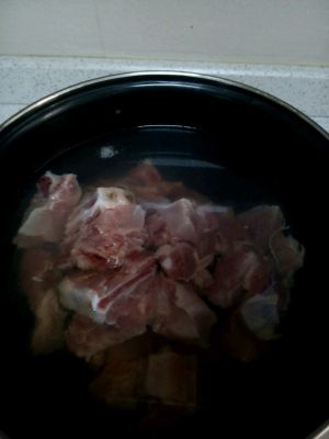 凉水放排骨、葱、姜、八角、花椒、料酒、少许醋大火烧开。