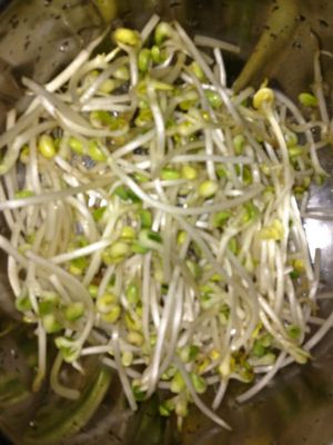 烧开一小锅水,将豆芽洗净后,放入开水中烫一下,捞入大盆中,按个人口味撒一点盐,备用。