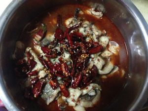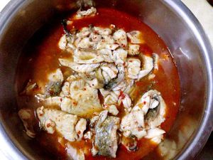 在干净的炒锅中加平常炒菜三倍的油,油热后,放入三大匙豆瓣(或剁炒)爆香,加姜、蒜、葱、花椒粒、辣椒粉及干红辣椒中小火煸炒。出味后加入头尾及鱼排,转大火,翻匀,加料酒和酱油、胡椒粉、白糖适量,继续翻炒片刻后,加一些热水,同时放盐和味精调味(要尝一下咸淡)。待水开,保持大火,一片片将鱼片放入,用筷子拨散,3~5分钟即可关火。把煮好的鱼及全部汤汁倒入刚才盛豆芽的大盆中。