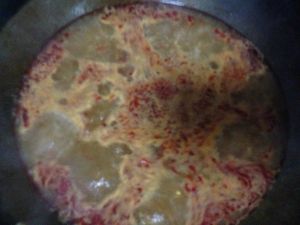 把油烧烫,放入花椒30s后,放入姜蒜一半的生辣椒以及三勺辣椒酱炒香,倒入四小碗水,放入适量盐,等水煮开