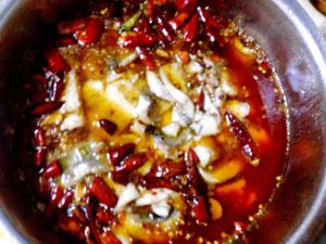 另取一干净锅,倒入半斤油(具体油量要看准备的容器大小,以倒入大盆中时,把鱼和豆芽全部淹没为准,可以目测一下)。待油热后,关火先晾一下。然后加入多多花椒及干辣椒(看个人的嗜麻辣程度),用小火慢慢炒出花椒和辣椒的香味。注重火不可太大,以免炒糊。 5、辣椒颜色快变时,立即关火,把锅中的油及花椒辣椒一起倒入盛鱼的大盆中。这样香喷喷的水煮鱼就好了。