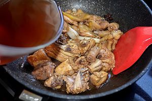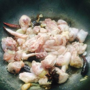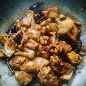 加花雕酒30克,翻炒一会儿,使鸡肉微微发黄,炒出鸡油,微微有点焦糖色。