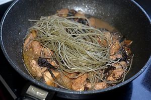 加入泡软的粉条,炒匀后继续用中小火炖。