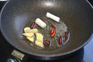 锅中倒油,先将葱段姜片,八角,辣椒放入炒出香味,将辣椒捞出不要
