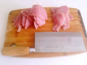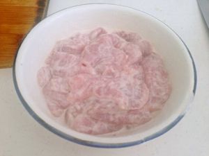 里脊切片,3-5mm厚,反复凉水冲洗,并在水里泡30分钟