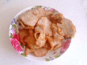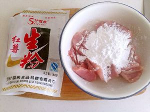 锅入足量的油。等油温升高后,把肉片粘上淀粉。下入锅中。待稍微变色后取出。