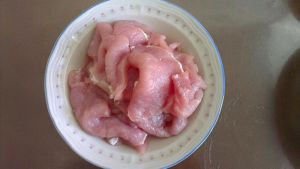 里脊肉洗净切片,大约5mm(和牛肉一样切法,不要顺着丝切