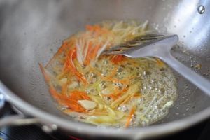 另起一锅,加入一点食用油,然后加入之前切好的葱白、生姜、胡萝卜丝,炒匀。
