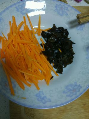 把胡萝卜切丝,因为家里还剩了点木耳,所以就临时加了木耳