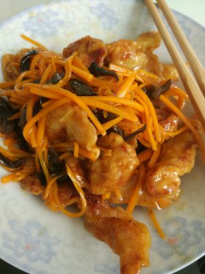 把切好的葱丝胡萝卜丝姜丝下锅炒制,加入事先调好的糖醋汁,勾薄欠,然后倒入炸好的里脊肉,翻炒出锅