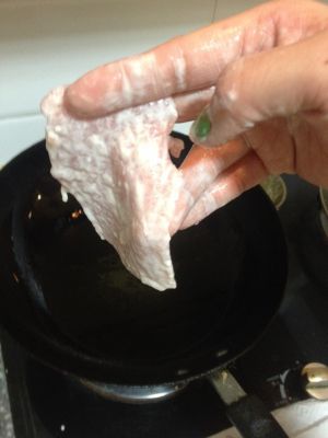 做油 把肉片两面均匀的挂上面糊 下锅炸硬壳 (动作要领 油温烧至六成热 下肉片 快些下。下至肉片的一半是停 把锅里的肉片炸至硬壳 捞出 再去炸另一半 )