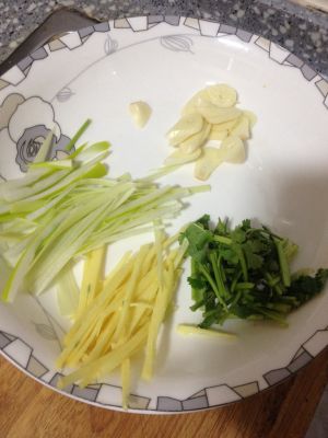 把肉切片。放点盐,腌制10分钟,我手比较笨。切片切的不好。