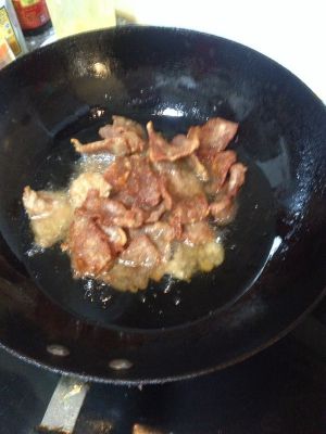 把锅烧热。放油。 烧制八成热。 把肉片一片一片下锅炸成金黄色。炸好后,在把油锅烧热。, 复炸第二遍。