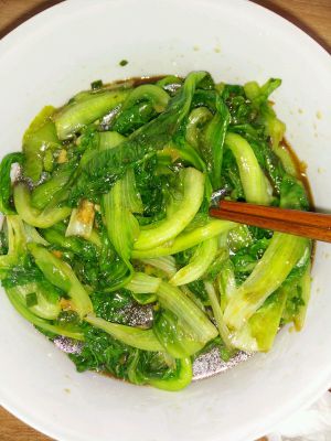 把滤好水的生菜装到盘子里,浇上蒜蓉蚝油汁,拌好,一道味美健康的蚝油生菜就完成啦!