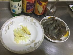 倒入适量料酒、大葱、姜丝、花椒、胡椒粉腌制半小时(适合用大一点面积的容器去腌制,比如把虾在盘子中摊开,这样更入味)。