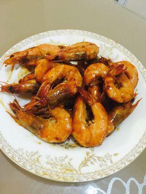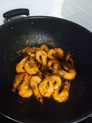 锅内留底油放入葱姜蒜煸炒爆香,倒入调好的料汁。倒入刚炸好的虾,加入一瓶盖料酒,盖上锅盖,中小火焖烧至收汁,出锅前视情况加盐即可。
