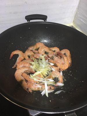 热锅下虾,炒出红油,放入葱姜蒜丝,翻炒