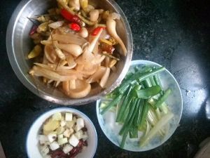 泡萝卜切丝,大蒜切片,大葱切断,干海椒切断,姜切片