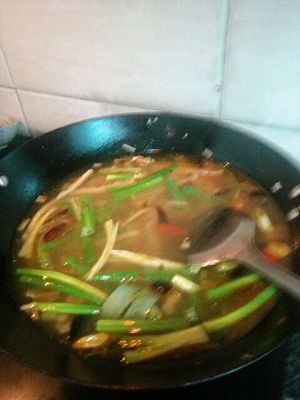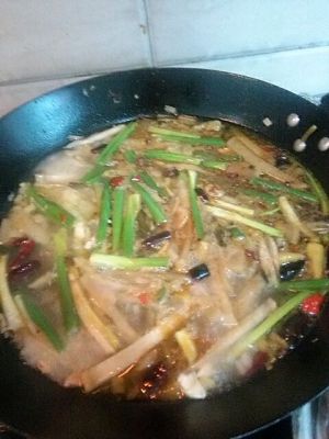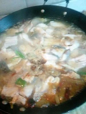锅中放油烧热,最好是大油,不过为了……还是用普通的油做吧!待油有6成热时将豆瓣酱、大蒜(颗粒)、生姜(颗粒)放入,然后将山辣椒及酸菜放入锅中翻抄 ,香气溢出后将放入鱼头和鱼骨。然后加入水或者高汤烧开 (冷水为佳)