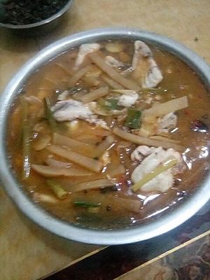 小火炖煮5-7分钟,然后将鸡精、盐调味。可用小勺舀少许汤尝试。(鸡精略多)
